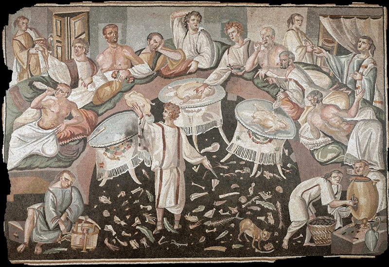 I banchetti romani erano movimentati. Fiumi di vino, montagne di cibo, commensali sdraiati tre a tre, in multipli di nove (gli invitati principali) ma anche una piccola folla di servi, clienti, schiavi liberati, intrattenitori. Senza contare che a tavola non si usavano le posate (a parte i cucchiai) e il cibo veniva portato alla bocca con le mani o passato dagli schiavi.