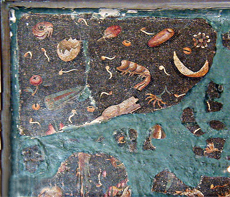 Plinio il Vecchio nella Naturalis Historia (36, 184) che fu il mosaicista greco Soso da Pergamo (II sec a.C.) inventò un trompe d’oeil pavimentare con resti di cibo disegnati in stile naturalistico.