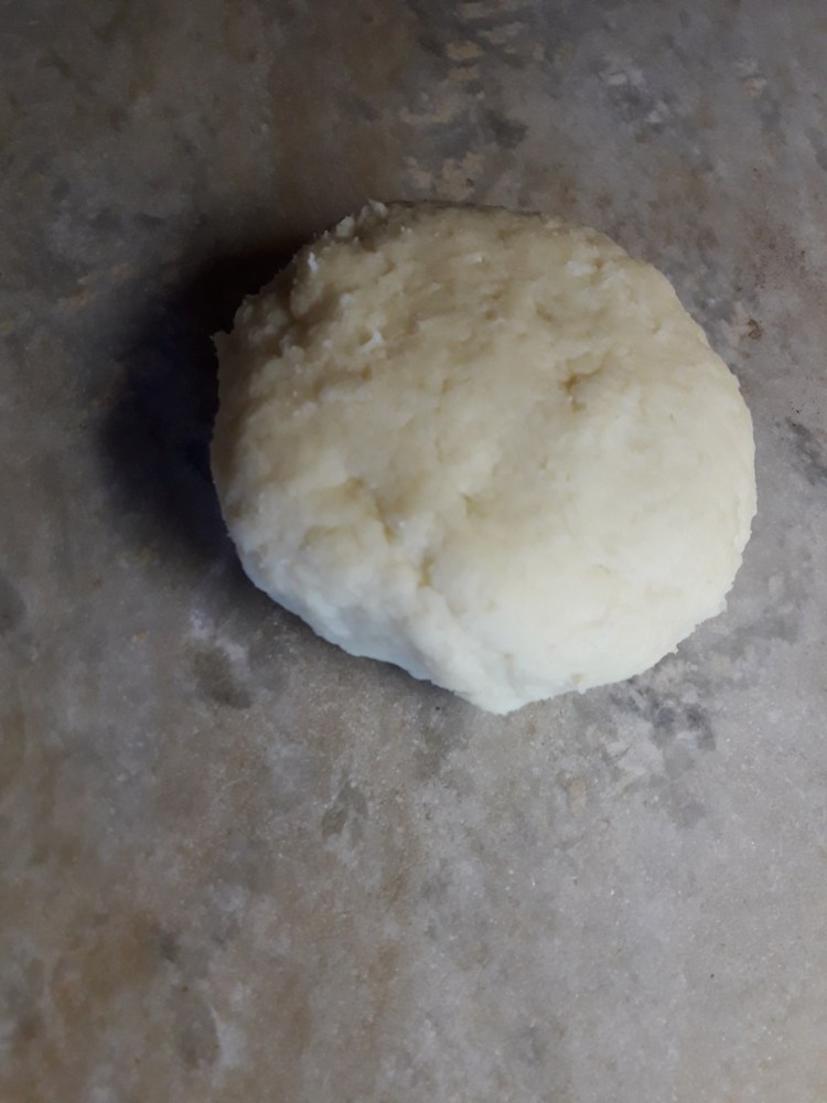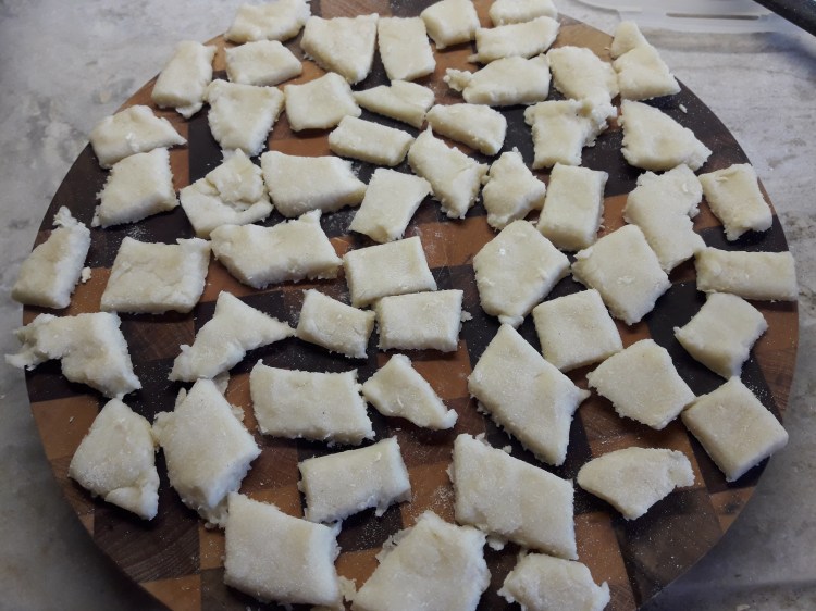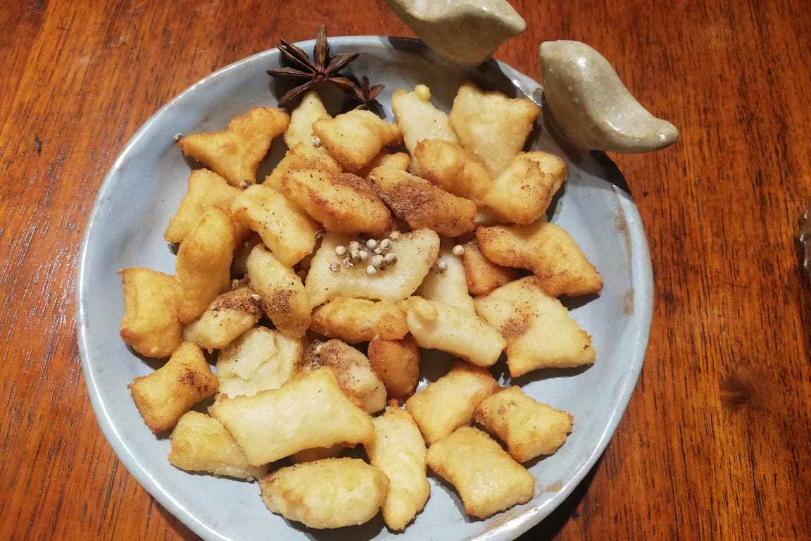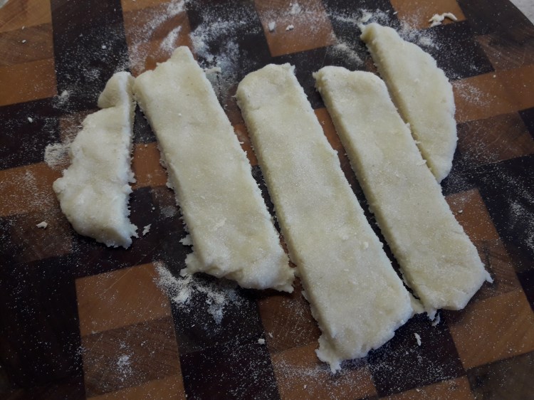 Faccio bollire vigorosamente 500ml di latte. Setaccio poi 275g di farina nel latte cercando di non farla raggrumare. Impasto con decisione. Ne viene una pallina di pasta elastica. La stendo, la taglio in rombetti e poi li friggo in olio bollente.