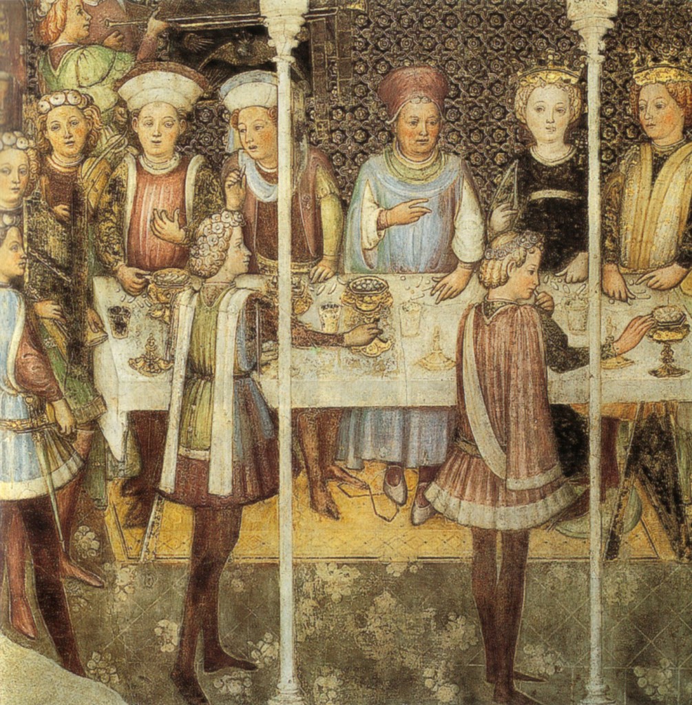 Temo peró, vista l’indisponibilitá dello zucchero nel VII secolo, che gli Zavattari, come accadeva spesso, raffigurarono un banchetto di nozze della loro epoca (settecento anni dopo) senza curarsi troppo dell’ esattezza storica.