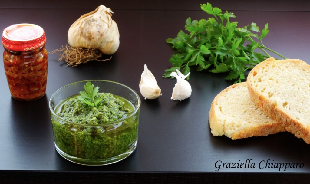 100 g di prezzemolo, 4 acciughe sotto sale, 3 spicchi d’aglio, 50 g di mollica di pane raffermo, ½ bicchiere di aceto di vino rosso, ½ bicchiere di olio extravergine di oliva, 1 peperoncino piccante (piccolo)