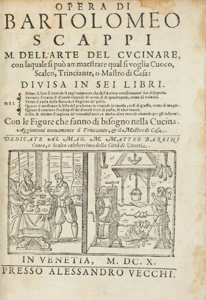 Per le attuali “fritole” veneziane, che come abbiamo visto hanno una lunga storia che inizia in Grecia e a Roma ma passa anche per la Persia e per Napoli prima di arrivare, o ritornare, a Venezia, si considera come base la ricetta di Bartolomeo Scappi. Cuoco del Cinquecento, serví alla corte dei Papi (Paolo III, Pio V) e fu gastronomo stimatissimo nelle corti italiane. La sua “Opera” segna e registra di fatto il confine tra la cucina medievale e quella moderna delle corti.