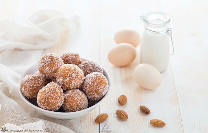 FRITTELLE BIANCHE: si fanno con latte di mandorle e farina frumento da lasciar “levare” (lievitare). Forse noi potremmo aggiungere un po’ di bicarbonato, anche se la ricetta non lo dice. Poi si friggono e si coprono di zucchero a velo.