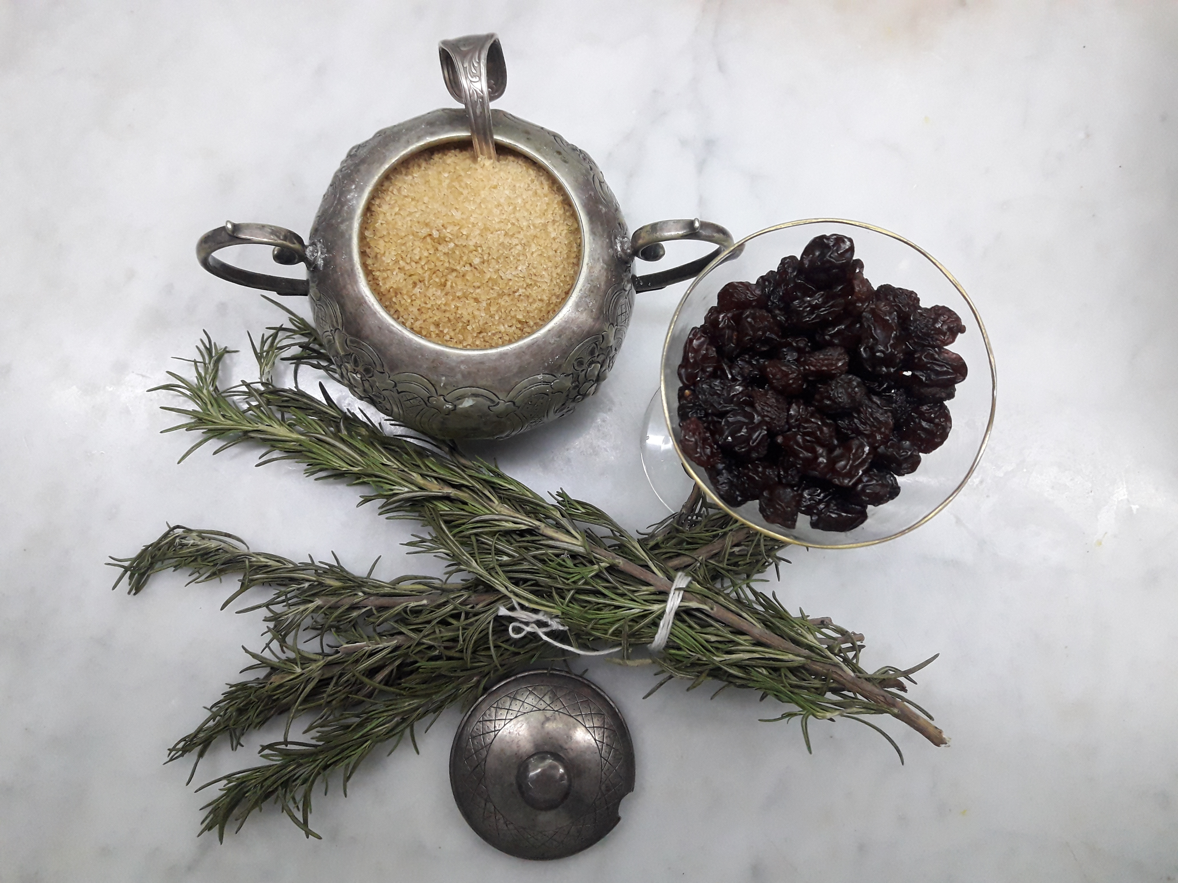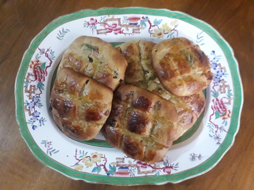 Ho ammorbidito l’uvetta in un bicchiere di Vin Santo, e ho aromatizzato l’olio riscaldandolo con rosmarino tritato fine a coltello. Poi ho mischiato alle polveri (farina, sale e zucchero) i liquidi (olio aromatico e acqua) e il lievito.