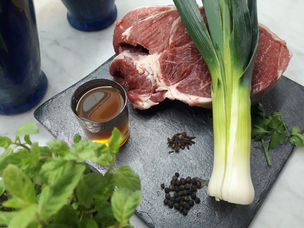 In veritá, la carne di mucca da usare stufata e cotta in una casseruola, con un sughetto, appena tirata fuori va lavata sotto l’acqua corrente, e cosí va bollita in acqua pulita nella giusta quantitá, in modo da non dover aggiungere altra acqua. E quando la carne è cotta, aggiungere mezza bucula di aceto forte, e aggiungere le teste di porro e un po ‘di menta, sedano o finocchio e cuoci per un’ora. E poi aggiungi tanto miele quanto metà della quantità di aceto o di piu’ a seconda di quanto vuoi che sia dolce, e poi cuoci a fuoco basso, mescolando spesso la pentola e la salsa si amalgama bene con la carne. Per questo schiaccia: 50 grani di pepe, la giusta quantitá secondo il tuo gusto di costos (si puo’ sostituire con citronella*), spicanarda (lavanda), e chiodi di garofano pestati. Trita bene in un mortaio di terracotta aggiungendo un po’ di vino, quando sarà ben tritato, mettilo in una pentola e mescola bene in modo che prima di toglierlo dal fuoco si scaldi un po’ e lasci uscire la sua essenza. Quando tutta via hai a disposizione miele, o sapa (mosto cotto*) o vino cotto, uno di questi, come detto sopra, aggiungilo e se non lo cuoci in un tegame bucculare, ma in una pentola di terracotta, avrà un sapore migliore.