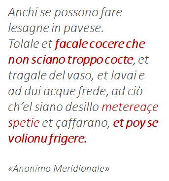 A recipe full of emotions, this “pasta recipe” from Anonimo Meridionale. For the first time in history we read that the dough is to be boiled. The “lasagne” were known by the Greeks and Romans, but they were eaten either roasted or boiled. The idea of boiling pasta is a medieval introduction