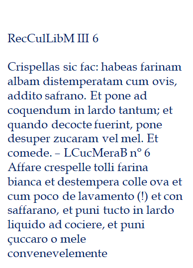 We must also notice that “frittelle” are a very ancient recipe. Apicius presents them as “globus” and recommends to eat them hot. We have recipes of frittelle, and frittelle di Sambuco, also in the arabic book that are considered the sources of the Liber and the Anonimo Meridionale. And, we have this same recipe in the tuscan manuscript Anonimo Toscano. Chefs were travellig, as much as kings and…poets.