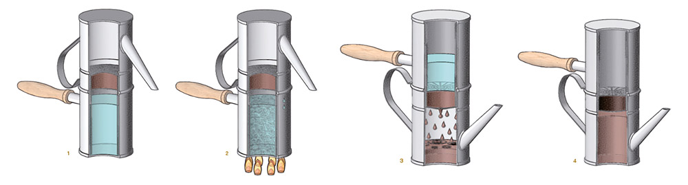 Veniamo pero’ alla vera protagonista di questo post, che per una volta non é la Loren ma la “cuccumella”. La nostra amata caffettiera napoletana é, a ben vedere…francese. Si attribuisce infatti al “ferblantier” Morize (brevetto 1820, che modifica un suo modello del 1814) l’invenzione della “nonna” della cuccumella. Era in rame, e l’avevano preceduta i modelli di Hadrot (1806) e Sené (1815) in materiali piu’ economici ma meno salubri.