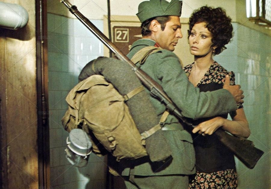 Prima dell’ orrore, della guerra e degli addii, la scena madre del viaggio di nozze é occupata da una grande frittata. Nel bel casale lombardo della madre di Antonio, vediamo Mastroianni ai fornelli e la Loren impacciata a preparare la tavola. Allo stupore di Giovanna sull’ enormitèa della frittata, Antonio risponde: “la prima notte di nozze mio nonno mangiò una frittata con 24 uova”. Una scena improbabile, quasi una gag in un film tutt’altro che ridicolo, che vuole, forse, raccontare, l’intensitá dei gesti semplici, che non arriveranno mai a diventare quotidiani, prima di una tragedia tutto sommato annunciata.