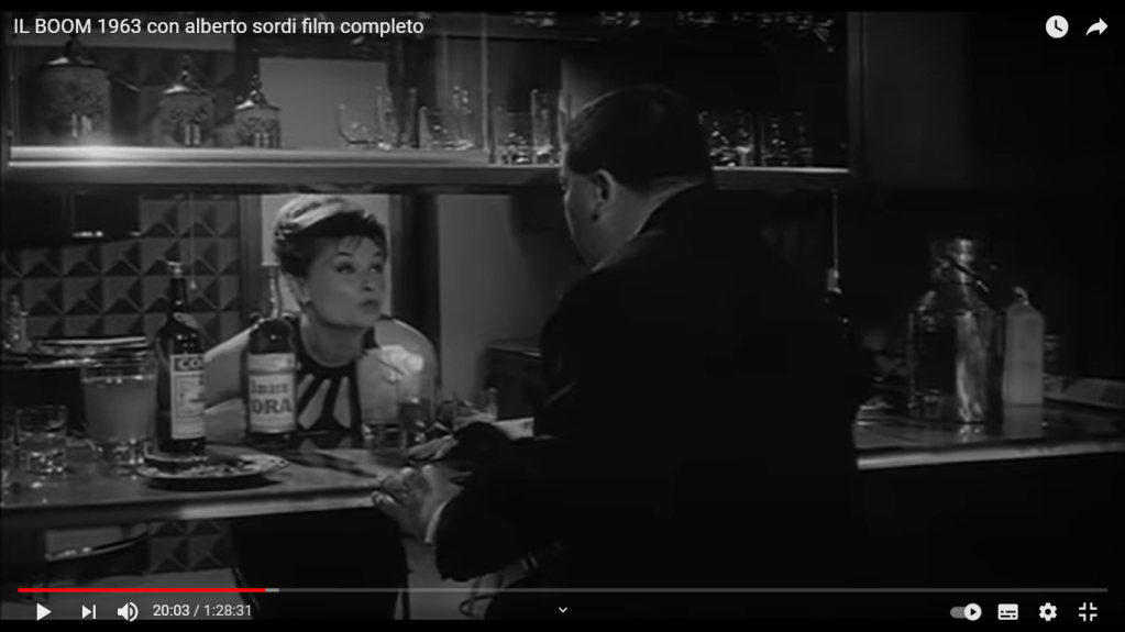 La serata prosegue nella splendida casa dell’imprenditore presso cui lavora Giovanni, e tra un twist e una partita a carte, vediamo un attrezzato mobile bar con bottiglie di amari e liquori nazionali, mentre il padrone di casa sorseggia wisky