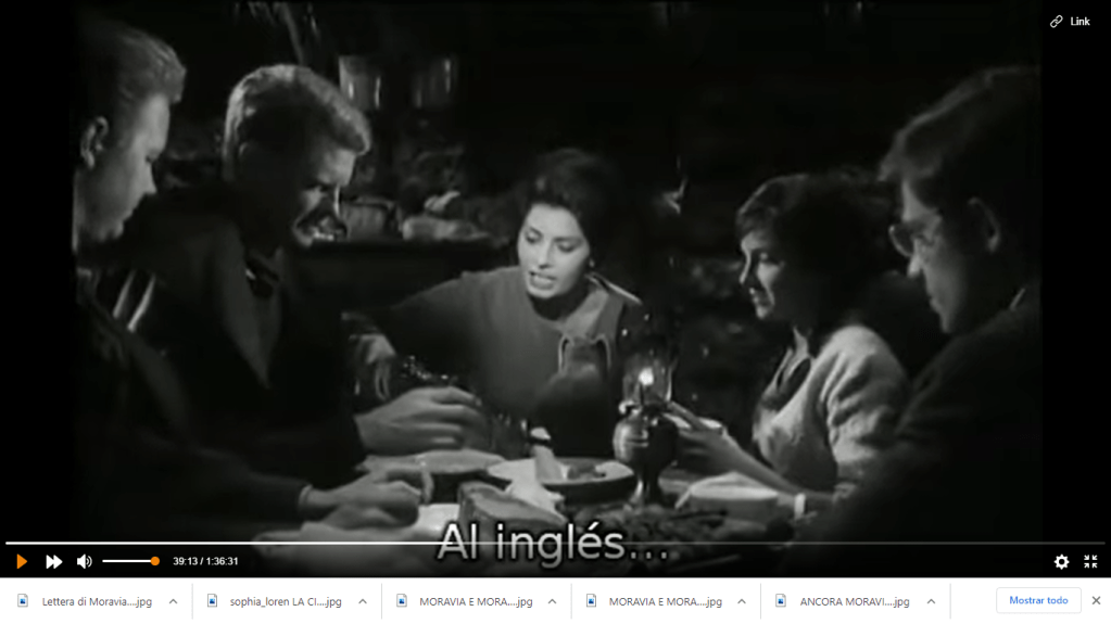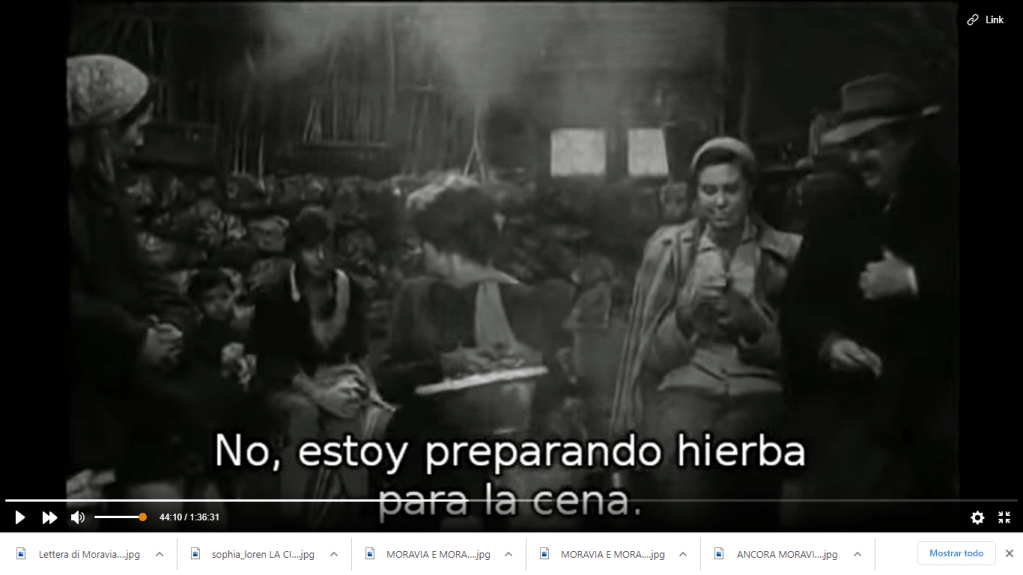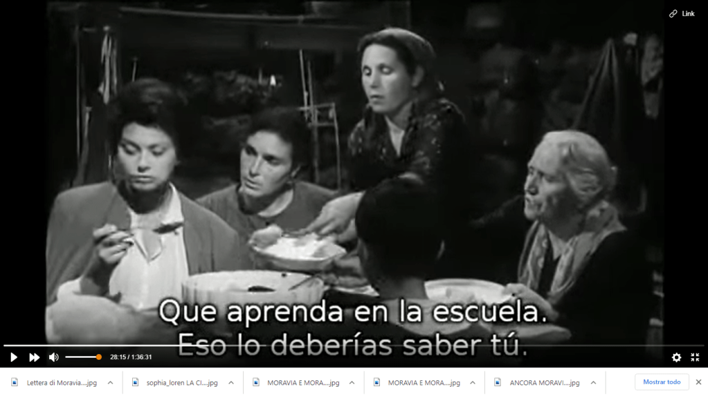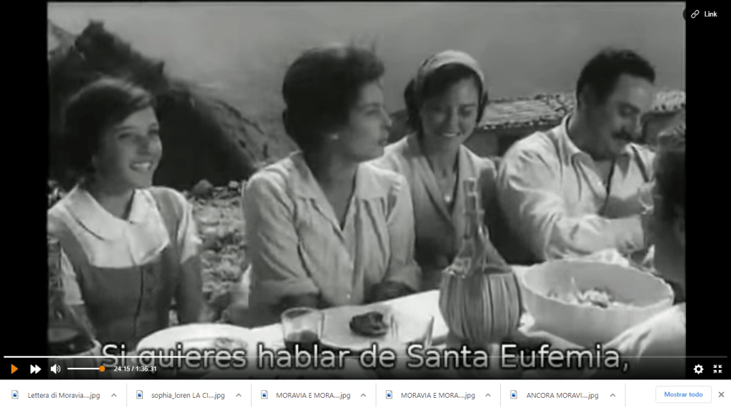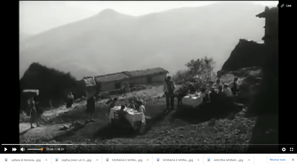 Dopo un viaggio faticoso, parte in treno e parte a piedi, al minuto 23 Cesira (Sofia Loren) e la figlia Rosetta arrivano ad un gruppo di capanne in montagna: Cesira era nata qui, prima di sposarsi e andare a Roma dove con molti sforzi aveva “messo su” un bel negozio di alimentari. Il viaggio é stato duro, ma subito l’accoglienza al villagio é festosa: fuori si festeggia un banchetto rustico ma con tovaglie bianchissime, musica e grandi fiaschi di vino. I trailer del film enfatizzano le scene tragiche ma la maggior parte della vicenda riguarda invece la vita del villaggio e degli sfollati, che cercano di attraversare con una certa allegria le circostanze complicate.