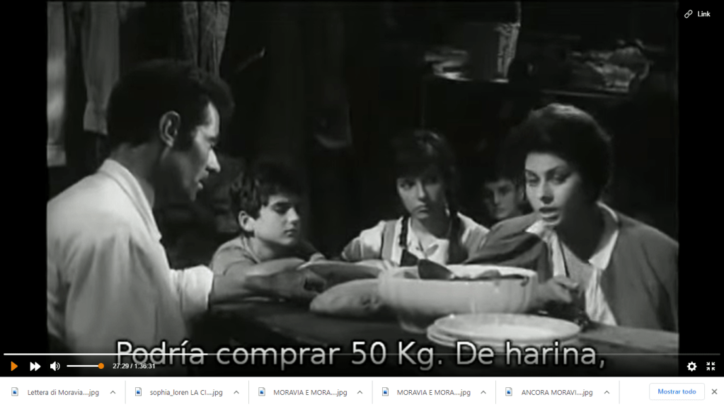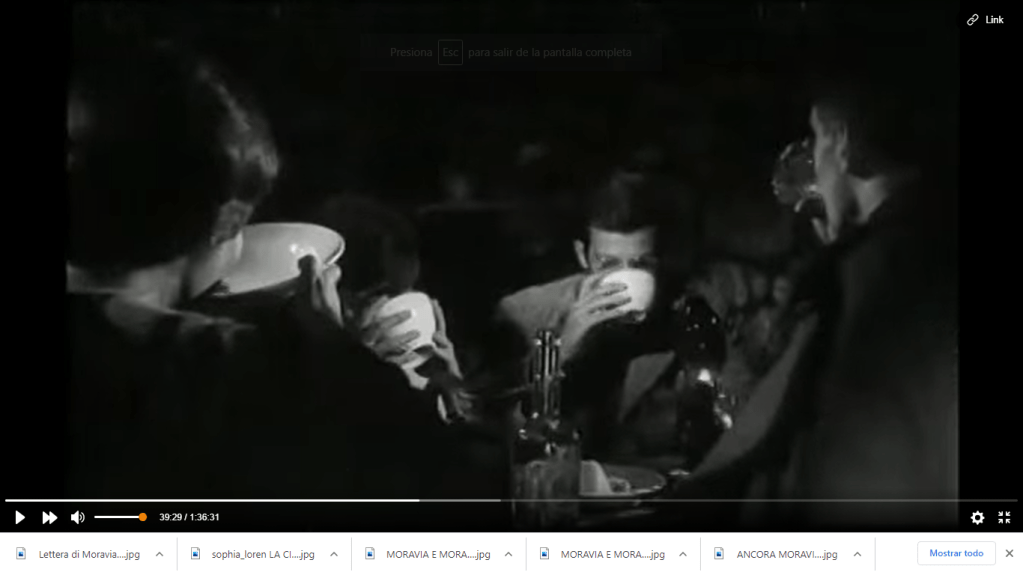 Tornata dai successi Americani, una Sofia forse troppo bella e sofisticata per la parte, arricchisce la Cesira di Moravia di leggerezza, almeno fino a quando una brigata fuori controllo di marocchini fa precipitare la situaizone. Un film tragico narrato con grande umanitá. Un film di guerra ma anche di cibo, o meglio di assenza di cibo, che ce lo rende ancora piú caro. Del libro di Moravia, e di cosa lo abbia motivato, abbiamo giá parlato ampiamente in un altro post Moravia ciociaro tra zuppe e peperoni.