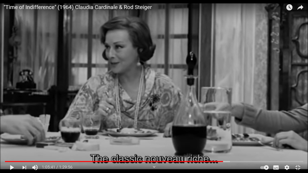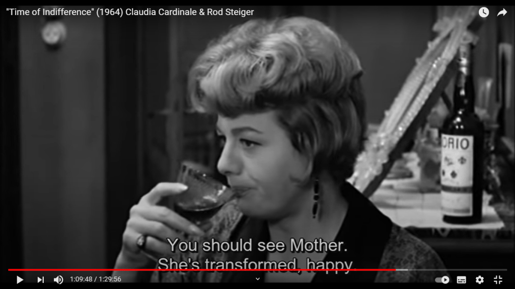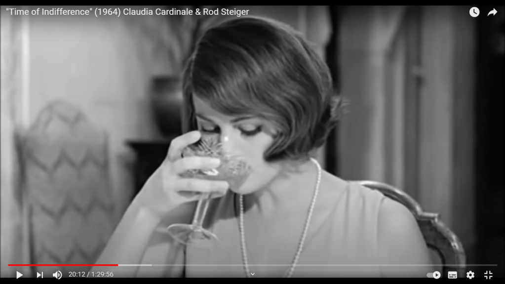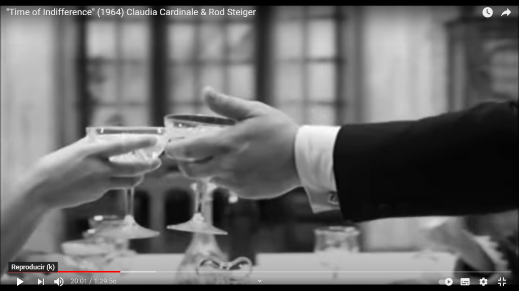 Cena elegante per il compleanno di Carla al minuto 19:59. Una bottiglia di Moet e Chandon sul tavolo (senza secchiello) e molti brindisi in coppe di champagne. Belle le coppe, di baccarat intagliato, e ancora piú belli i bicchieri liberty da vino bianco decorati con foglie di vite. Mentre Marumechi viscido e minaccioso brinda al “nuovo marito di Carla”, lei si ubriaca e si lascia andare ad una piú che giustificata crisi di pianto e nervi. Ma noi, “indifferenti”, ci domandiamo da quanto tempo le coppe di champagne siano state soppiantate dagli odiosi flute, in cui non entra il naso.